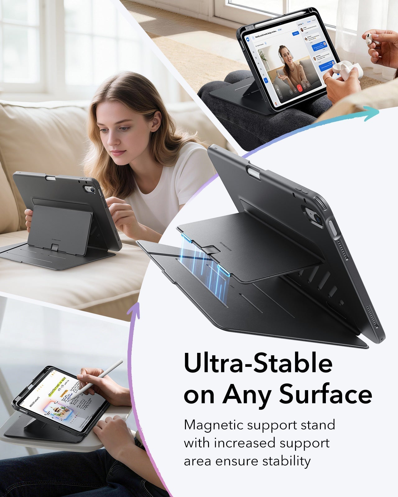 Ultra-Stable Stand: a wide support bracket magnetically locks into grooves in the base, giving it superior stability, even when using your iPad on your lap