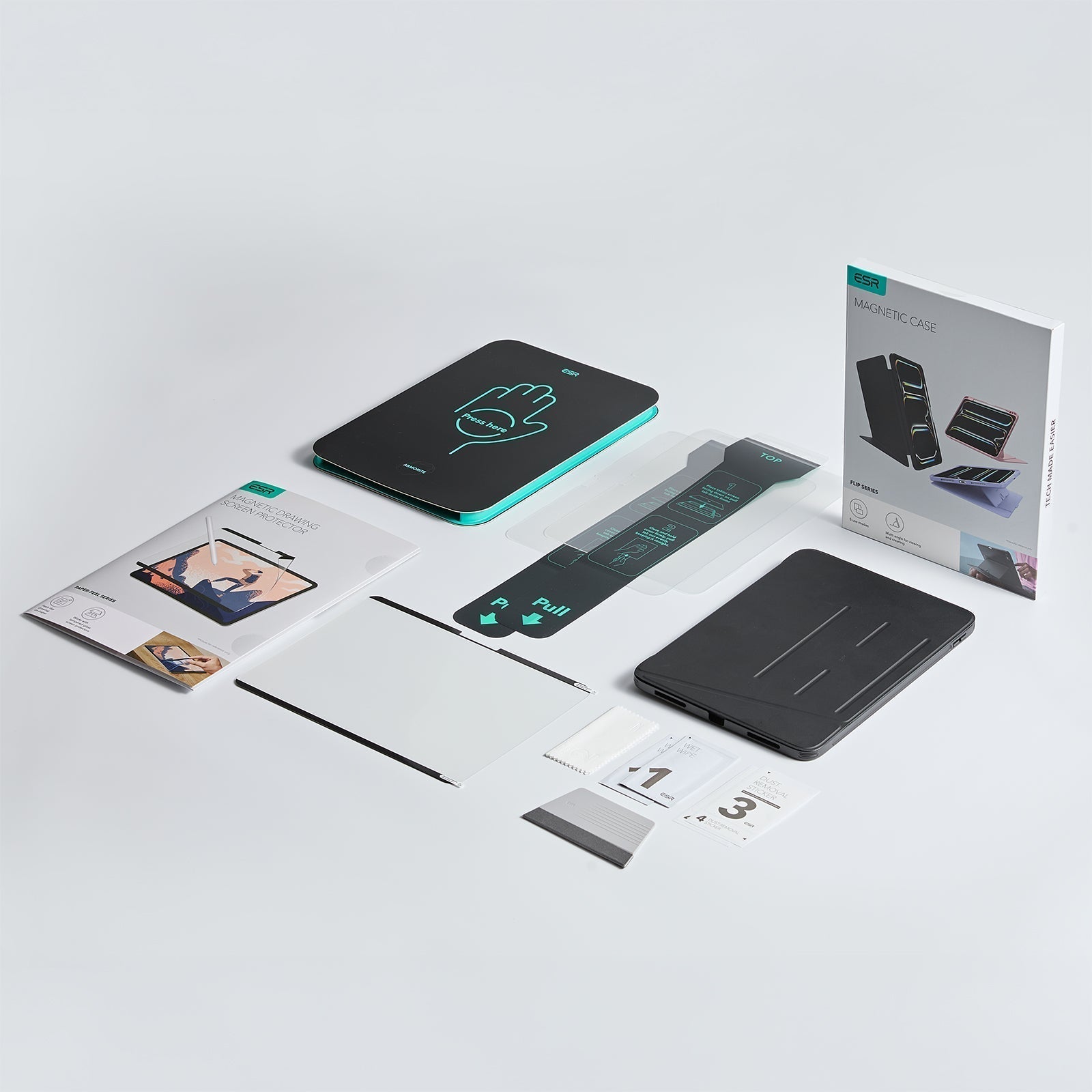 In the Box: Flip Magnetic iPad case with Pencil Slot, 2 Armorite® Glass Screen Protectors, Pencil-friendly Paper-Feel Magnetic Screen Protector, cleaning kits, and installation tray