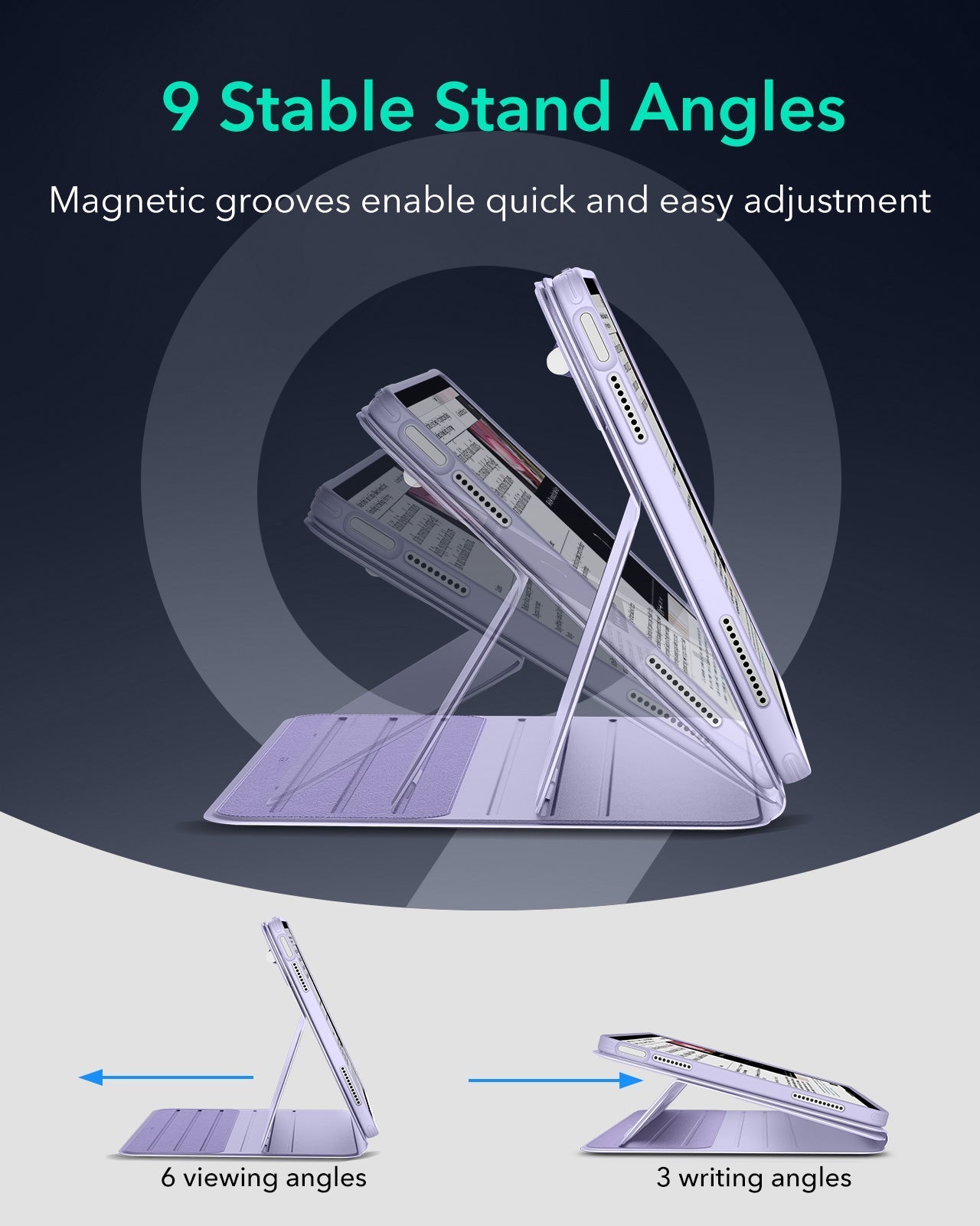 Ultra-Stable Stand: wide support brackets magnetically lock into grooves in the base, giving it superior stability, even when using your iPad on your lap