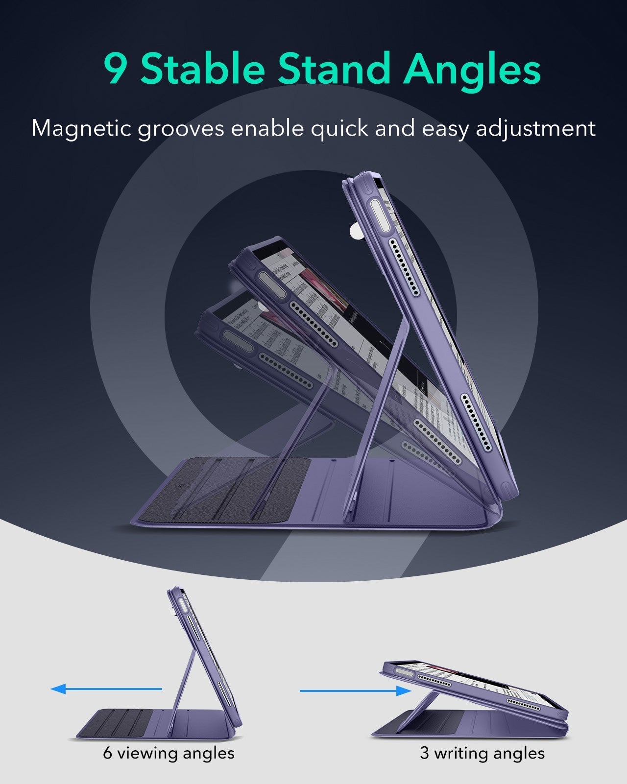 Ultra-Stable Stand: wide support brackets magnetically lock into grooves in the base, giving it superior stability, even when using your iPad on your lap