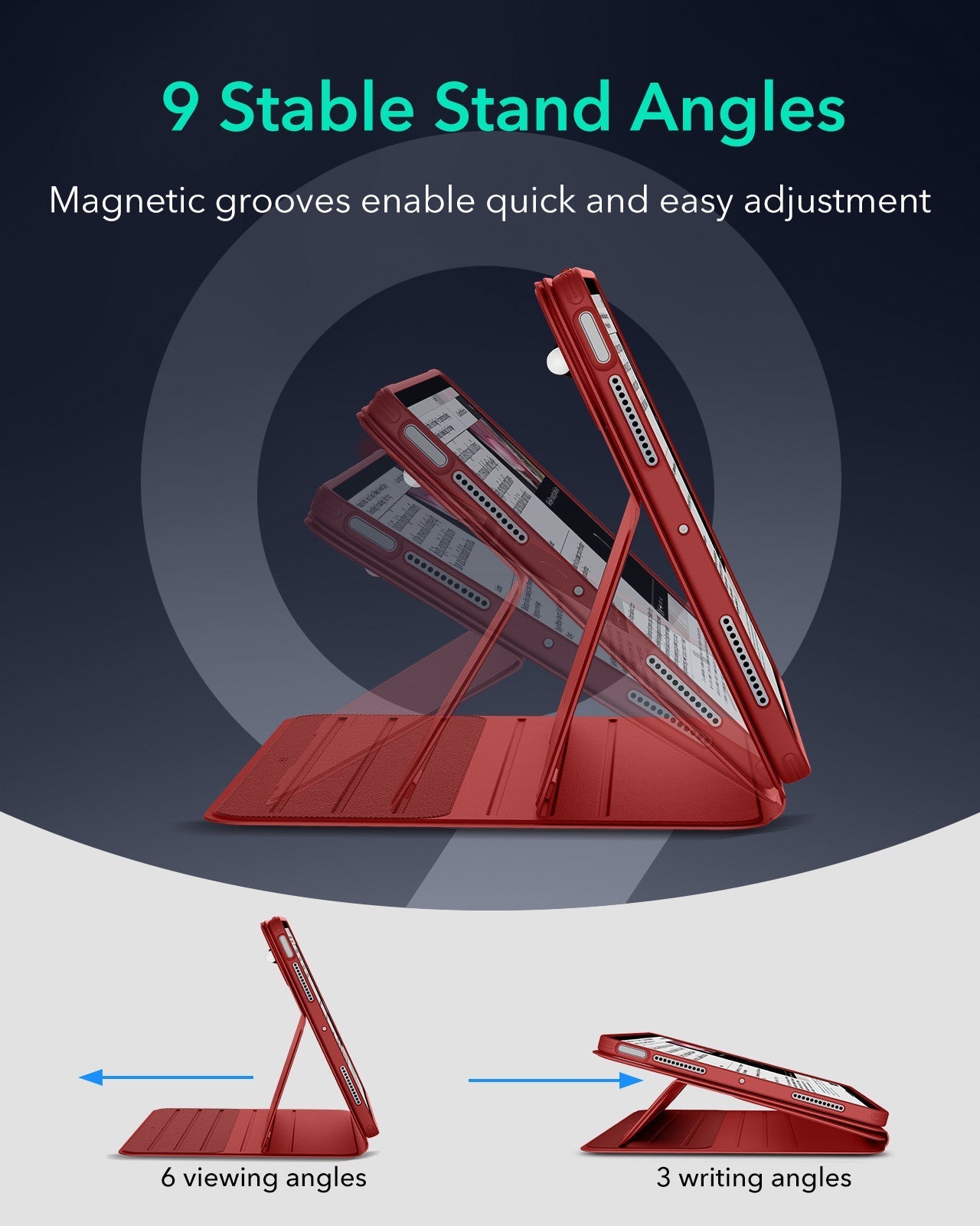 Ultra-Stable Stand: wide support brackets magnetically lock into grooves in the base, giving it superior stability, even when using your iPad on your lap